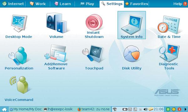 Работает ASUS Eee PC под управлением Linux-ОС Xandros – специально доработанной инженерами компании для Eee PC системой Debian. Предусмотрена возможность работы и под управлением Windows XP, однако в этом случае ноутбук будет дороже. Графическая оболочка хорошо проработана и очень удобна. На «Рабочем столе» предусмотрено шесть закладок: Internet, Work, Learn, Play, Settings и Favorites – в них сгруппированы пиктограммы для запуска соответственно коммуникационных программ, офисного ПО, обучающего ПО, игр и настроек. Интерфейс системы явно ориентирован на неопытного пользователя и этим великолепен: ноутбуком смогут легко пользоваться и школьники, и представители старшего поколения, которые, как правило, с компьютерами не на короткой ноге. Крупные и понятные пиктограммы позволяют быстро найти нужную программу. Хотя на «Рабочий стол» вынесены только самые необходимые программы, как и любой другой Linux, Xandros даже в базовой поставке предлагает огромное количество ПО.