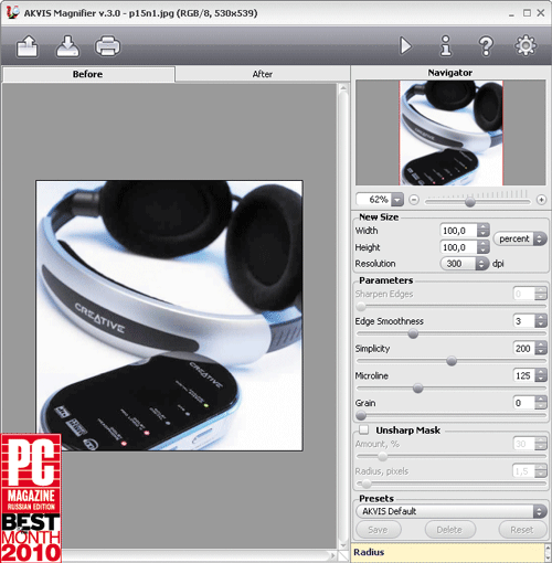 Программа, предназначенная для увеличения графических изображений без потери качества. Максимально возможный размер получаемого с помощью программы изображения – до 30 тыс. пиксел по ширине и высоте (т. е. 900 Мпиксел), при этом восстанавливаются границы и детали, подавляются мелкие дефекты и JPEG-артефакты. www.akvis.ru