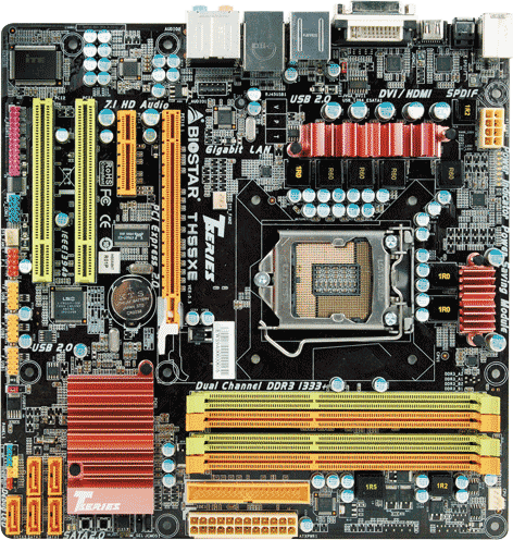 Системная плата для процессоров Core i7/i5. В ней реализованы фирменные технологии BIOSTAR, такие как Dura Max, плата имеет семифазную схему питания, четыре гнезда для модулей памяти DIMM (до 16 Гбайт), разъемы PCI-E 2.0x16, PCI-Eх4 и PCI (два), пять портов SATA 2 и гнездо eSATA2. www.biostar.com.tw