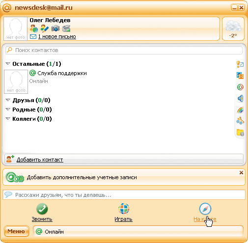 Новая версия популярной программы мгновенного обмена сообщениями. В «Mail.Ru Агент» 5.6 реализована возможность подключения к геолокационной службе, созданной на основе проекта «Карты@Mail.Ru». Пользователь может указать свое местоположение на карте мира, определить кому из окружающих будет доступна эта информация, просмотреть на карте, где в данный момент находятся друзья и даже отслеживать их перемещения в реальном времени (при условии, что у них установлена и функционирует мобильная версия «Mail.Ru Агент»). http://agent.mail.ru
