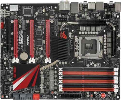 Именно такой прицел берет очередной продукт ASUS в «игровой» серии Republic of Gamers, – Rampage III Formula с разгонной функциональностью ROG Connect. В шесть гнезд для модулей памяти этой системной платы формата АТХ c процессорным гнездом LGA 1366 на НМС Intel X58+ICH10R можно установить до 24 Гбайт ОЗУ (вплоть до DDR3-2200) в шести разъемах. Гнезда расширения – 3xPCI-Е 2.0 x16 (в режимах x16/х0/х0, x16/x16/х0, x16/x8/x8), 2xPCI-E x1, 1xPCI 2.2.