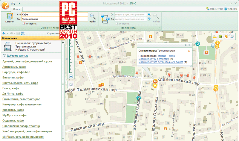 Электронный справочник-карта по Москве компании «ДубльГИС». Версия для ПК позволяет находить адреса, телефоны, маршруты проезда на общественном транспорте. При поиске можно учитывать дополнительные критерии – например, время работы предприятий. В первом выпуске «2ГИС Москвы» – 380 тыс. зданий, 160 тыс. реально работающих предприятий, 150 тыс. действующих телефонных номеров. 2gis.ru