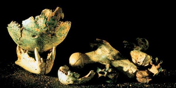 Массивные австралопитеки часто служили добычей леопардов. Доказательством тому — совпадение зубов хищника с отверстиями на черепе гоминида, как показано слева на фотографии. Южная Африка, пещеры Сварткранс