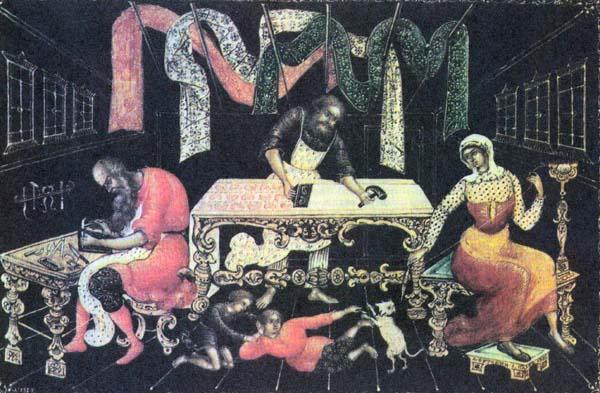 Диодор Андреевич застал еще время ивановских холстов (с них начинались ивановские ситцы), научился набивать на тканях узоры: отсюда и пошло название профессии — «набойщик». Первые краски были олифа да сажа. Художественное чутье было у ивановских крестьян в крови: в этих краях испокон лека жили иконописцы, рядом с селом Ивановом располагалась слобода Иконниково, неподалеку — Палех и Холуй. Традиции деревянной резьбы, привычной для этих мест, помогли мастерам-резчикам изготовлять «манеры» — деревянные набойные доски с узором. Суровый холст, черные сажевые перекрестия орнамента, живо напоминающие о деревянной резьбе,— так выглядели набойки XVII—XVIII веков.