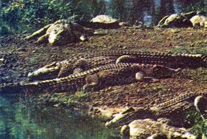 Пока Хосе рассказывает, мы подходим к одной из вольер — просторная яма в метр глубиной, края которой зацементированы. Никаких ограждений нет. Эта вольера — крокодильи «ясли». Здесь содержатся совсем маленькие животные, 15—20 сантиметров. Они черного или темно-коричневого цвета, на их коже еще нельзя различить характерных для крокодилов щитков, напоминающих панцирь, гребень чуть обозначен.