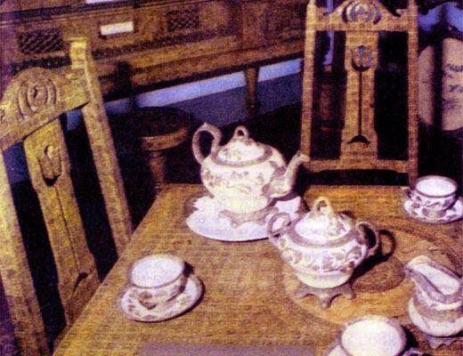 На первый взгляд это хорошо отреставрированная комната британской семьи среднего достатка конца прошлого века: большой камин, горка с фарфором, пианино красного дерева, аквариум, пальма в горшке, ваза с фруктами на круглом столе, картины на стенах, глобус на каминной полке. Самая обычная комната, разве что многовато мебели и безделушек, что создает впечатление мещанского стиля или даже безвкусия.