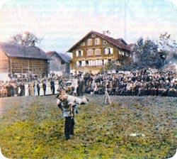 Швейцария: горы, двухэтажное шале, народный праздник; швейцарцы, как известно, весьма чтут свои традиции и охраняют их, даже диалект каждого кантона имеет все права гражданства.