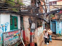 Росинья — крупнейшая фавела Рио (100 000 жителей). Там есть даже гостиница и банк, а в каждый дом проведено бесплатное электричество (как — показано на фотографии). Но общее впечатление от нее все равно удручающее