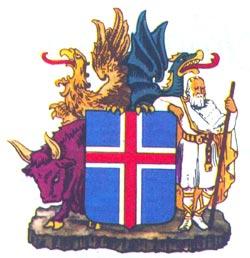 В 1918 году Исландия была провозглашена независимым королевством в унии с Данией. В 1944 году островное государство вышло из унии и объявило себя суверенной республикой. Тогда и был создан исландский герб. Геральдический щит несет рисунок национального флага и поддерживается сразу четырьмя щитодержателями. Они же духи-хранители Исландии. Согласно древним сагам они должны охранять остров от датских королей. Символика цветов исландского флага — червленый огонь вулканов, серебряная вода гейзеров, лазурь моря и неба.