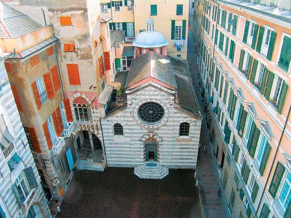 С террасы Дворца Ламбы хорошо виден и духовный центр Генуи — собор Сан-Лоренцо. Как и полагается кафедральным храмам, он представляет сложное переплетение разновременных мод и традиций. Не без грандиозности. Не без неоконченности (вторую колокольню на фасаде так и не построили). Готическая структура соседствует с поздними неоклассическим декорациями, примитивные фрески ex voto, созданные по обетам, — с богатыми барочными алтарями.