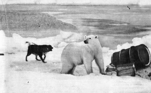...Крикнув своего любимого пса Якоба, Амундсен сошел на лед и направился в сторону ближайшего тороса. Пес весело бежал впереди. Вдруг перед самым торосом он остановился, стал беспокойно принюхиваться, а затем с лаем бросился за ледяную глыбу, но через мгновение, прижав уши и распластавшись на бегу, уже мчался назад. Из-за тороса выскочила огромная белая медведица. Увидев человека, она моментально остановилась и в изумлении уселась на снег. Застигнутые врасплох, зверь и человек некоторое время молча смотрели друг на друга.