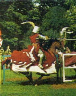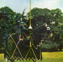 Кстати, найти храбрую и послушную лошадь и тогда и теперь — дело непростое. Долгие недели проходят, прежде чем лошадь привыкнет, не пугаясь, нестись во весь опор вдоль барьера, освоит конные доспехи, позволит тяжеленному рыцарю загружаться в полном