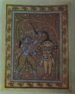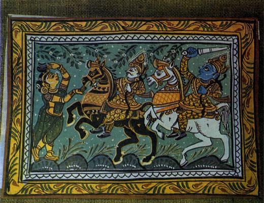 «Читра» означает «рисование, живопись», а «кара» — «делать, изготовлять». В литературе индуизма читракары упоминались в ряду низких каст ремесленников, хотя из века в век создавали бессмертные произведения искусства — фрески, миниатюры, расписные ткани. Здесь, в Ориссе, а именно в городе Пури, где с XII века стоит храм бога Кришны-Джаганнатха (то есть Кришны — Владыки мира) и куда со всей страны стекаются миллионы паломников, читракары издревле изготовляют «пата», или «пати», — яркие картинки-лубки на темы преданий из жизни обожествленного пастуха — героя Кришны, само имя которого значит «черный». Черным или темно-синим Кришну обычно и изображают. И здесь, в Ориссе, и по всей Индии. Герой был объектом поклонения местного темнокожего, доарийского, населения. Еще, видимо, в каменном веке. И на западе страны, и здесь, на востоке, известны легенды о том, что он вышел из земли в виде черного или синего камня (не исключено, что такое преклонение мог вызвать камень-метеорит). И это обожествление широко распространилось в среде местных жителей Древней Индии, а впоследствии было принято и арьями, которые, придя в Индию во 11 тысячелетии до нашей эры, стали постепенно включать в свою религию культы древних народов страны.