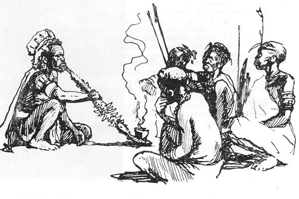 Мы уселись под деревом. Я тоже набил свою трубочку. Не курил только Киши. Он постоянно сосал некий состав, который называется саут: табак, истолченный с каким-то белым в красную крапинку камнем. Камень назывался атрун и отдавал резким запахом серы. Однажды Киши предложил мне отведать этого снадобья, и я едва не задохнулся с непривычки.