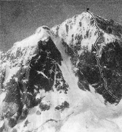 А вершина уже успела запастись снегом, и он сыпался непрерывным широким потоком, сбрасывая со стены камни и глыбы льда.