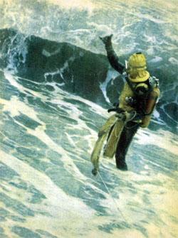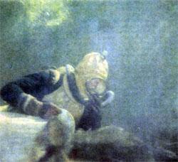 ...Первому погружаться выпало мне. Отплыв от берега на всю длину страховочного шнура — 100 метров, я просигналил и нырнул. Сначала холода не чувствовалось, вокруг была серо-зеленая дымка, постепенно переходящая в зеленоватый сумрак. На глубине 15 метров я очутился в «заколдованном кольце», а точнее — в «полом шаре»: вода и свет создавали этот оптический эффект. Куда бы я ни посмотрел, везде вогнутая стена сферы, за которой простирался мрак. Рассеянный свет проникал со всех сторон, но радиус видимости ограничивался 3—4 метрами. Я потерял ориентировку, крутясь в этой сфере, но, наконец, установив по капроновому шнуру, кусочек которого словно упирался в ту же темную стену, расположение берега, а по воздушным пузырям, идущим из автомата акваланга, — верх и низ пространства, продолжил погружение.