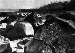 В первое же лето близ села Кондон было раскопано поселение— черепки из этого раскопа украшал знаменитый спиральный орнамент. Радиоактивный анализ углей древних очагов показал, что люди здесь жили около 4,5 тысячи лет назад. Итак, мастера приамурских сел, разрисовывавшие в прошлом веке халаты и обувь, следовали традиции, насчитывающей тысячелетия, — исследователям стало ясно, что петроглифы Сакачи-Аляна и искусство, следы которого открыл Шренк, — звенья одной культуры.