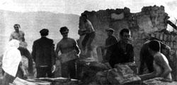 ...На развалинах группа приезжих молодых парней. Они вытаскивают пыльные саманные кирпичи, складывают их в кучи. Вместе с ними работают и хозяева развалин. Солнце, они все полураздеты и смеются. Не смеется только одна женщина. Печальная, закутанная в платок, она стоит рядом. «Кому смех... — грустно говорит она и качает головой. — Да что это я?» — вдруг говорит она громче и начинает вместе со всеми вытягивать из развалин застрявшее бревно. Потом я увидел, что она улыбнулась.