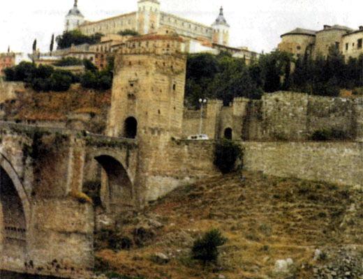 Вот главный вход в город — мост Алькантара. На первой из трех его арок — бронзовая позеленевшая табличка, врезанная в камень. Она выглядит такой же древней, как и все сооружение. Ничто не должно нарушать гармонию исторических памятников — таков принцип испанских архитекторов. Надпись на табличке гласит: «Мост Алькантара, жемчужина Толедо, соединяет в себе три стиля трех разных эпох и народов. Строительство моста было начато римлянами, завоевавшими Толедо во II веке до рождества Христова. В IV веке строительство продолжали вестготы. Завершилось оно в VIII веке во времена владычества арабов...»