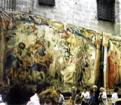 После долгих скитаний выхожу на широкую — по масштабам Толедо — улицу Сан-Исидро. Но мои мытарства были в конце концов вознаграждены, поскольку... я оказался на «улице гобеленов». Такое название напрашивалось само собой: вся она была сплошь увешана красочными полотнами. Они свисали со стен зданий по обеим сторонам улицы. Здесь было довольно многолюдно, и поначалу я рассматривал гобелены издали. Краски яркие, и рисунок хорошо виден. Потом, когда подошел поближе к одному из гобеленов, чтобы лучше его рассмотреть, меня поразили размеры этих художественных произведений. Фигуры людей, пеших и всадников, были в два раза крупнее, чем в жизни. На каждом гобелене изображен с десяток персонажей, не считая лошадей, собак, всякой другой живности, телег и карет. И все это на фоне деревенского пейзажа или замка, крепости, а то и целого города. Размеры самих полотен были примерно 8 на 10 метров. Гобелены старинные, но как сохранились! Нигде ни дырочки, ни вытертого кусочка. Сколько же труда нужно было затратить мастерам прошлых веков, чтобы сначала вручную соткать такой «холст», а потом вышить на нем разноцветными нитями целые картины?!