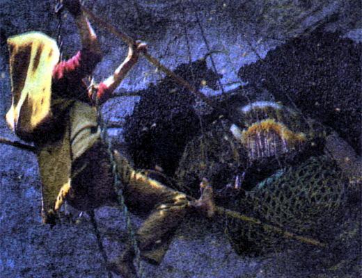 Мани Лал останавливается напротив гнезда около полутора метров в диаметре. Поверхность его усеяна тысячами крупных черных пчел. Два других охотника — Кришна и Акам — карабкаются на скалу снизу. Цепляясь за выступы, они прижимают лестницу к склону, чтобы Мани Лал мог дотянуться до гнезда.