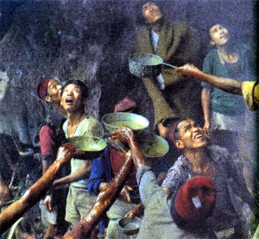 Тем временем разгорается костер у подножия скалы, но ветер сдувает дым. Указывая на вершину скалы, Мани Лал бросает несколько отрывистых слов, и в считанные минуты к нему опускается пучок тлеющих листьев. Дым обволакивает гнездо, и пчел охватывает паника. Ничто больше не отвлекает охотника: золотые соты остались без защитниц.