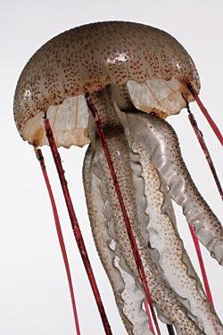 Выполненная с учетом мельчайших деталей строения светящаяся медуза (Pelagia noctiluca), кажется, застыла лишь на мгновение, Цвети прозрачность ее студенистого тела переданы безупречно