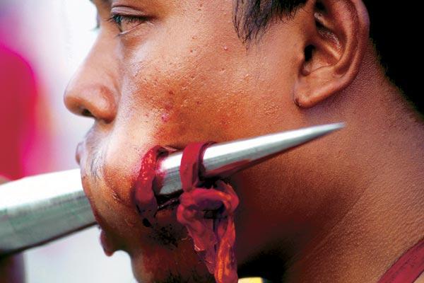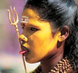 Перфорация языка трезубцем, воплощающим огненную стихию Шивы, — часть аскетической практики верующих. Женщина идет в храм Самайяпурам (штат Тамилнад, Индия), чтобы почтить богиню Мариамман