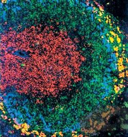 Моноклональные антитела прикрепляются строго только к своим мишенямэпитопам и могут доставлять к ним определенные молекулы. На снимке: участок ткани, в котором разные типы клеток окрашены четырьмя