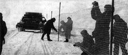 Самолет снижается над долиной реки. Уже виден загон, два черных сросшихся кольца, словно обручи, забытые на снегу. От них далеко убегает темная линия — изгородь загона, который потом объединит кольца воедино. Забродин прилипает к окну, стараясь увидеть как можно больше. И вдруг, когда снежные склоны закрывают небо, все замечают чуть рыжеватого на ослепительно сверкающем снегу песца. За кем-то охотясь, зверек замер в овраге и, глядя на снижающийся самолет, застыл. Зрелище довольно-таки неожиданное, так и хочется свистнуть, увидеть, как песец прыснет, взметнув хвост трубой.