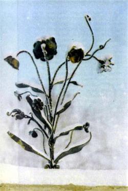 Казалось бы, железо — материал слишком грубый, чтобы служить украшением. Но уже в глубокой древности мастера использовали его ковкость — способность быть податливым и пластичным при сильном разогреве. И кузница была не последним местом, где проявлялось врожденное народное художественное чутье. Наверное, первыми коваными художественными изделиями на Руси были светцы. Польза и красота сливались в них неразрывно. Кузнецы выковывали светцы в виде небольших веточек с завитками и закрученными вдоль оси стержнями. Их вбивали в стену или в специальную подставку-стойку. Иногда расщепы в светцах делали в виде завитков, лучей с сережками, которые при легком сотрясении звенели и поблескивали в отраженном свете пламени лучины. И наверное, в темной низкой избе такой светец с горящими лучинами был похож на сказочный цветок...