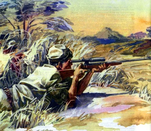Проснулся я с рассветом. Пели птицы. Выглянув из-под рваного холста, я увидел крошечную белоснежную птаху, которая сидела на черном шипе, а в далеком небе, словно крест, парил орел. Дождь кончился, небо прояснилось, и в сером свете бурые тона пустыни посвежели. По мере того как вставало солнце, голые крутые стены Лолокве становились багрово-красными. Водитель подкладывал в огонь сучья, раздувая головешки. Появился Эйб, который шел между колючими деревьями и казался жилистым и крепким в своей одежде защитного цвета. Он склонил голову, разглядывая землю. Я окликнул его, и Эйб сказал: