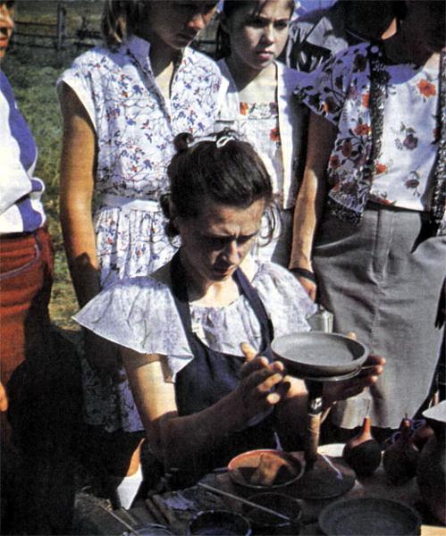 У дома крестьянина Ошевнева тоже толпился народ. Под гульбищем— широкой, резной верандой — расположились резчики по дереву. Вокруг расписные ковши, похожие на сказочные ладьи, с резным орнаментом кухонные доски, деревянные ложки. Их вырезают на глазах у зрителей из «баклуш» — заготовок. Денеша сразу заинтересовал огромный ковш с двумя ручками — взял его, на вес попробовал.