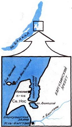 Сейчас этот залив чаще зовут Чивыркуйским. Многие знатоки Байкала считают, что нет на всем славном озере более богатого и красивого места, чем Чивыркуй с его бухтами, мысами и островами. Вот только некоторые их названия: бухты Окуневая, Сорожья, Крестовая, Змеиная, Крутая, Крохалиная; мысы Онгоконский, Фертик, Курбулик; острова Калтыгей, Бакланий или Шимай, Елена... Неподалеку от входа в залив лежат и самые таинственные острова Байкала — Ушканьи. Нынешний полуостров Святой Нос, соединенный с берегом низким перешейком, сравнительно недавно намытым рекой Баргузин, ранее был самым большим островом; его горные пики, словно зубья гигантской пилы, вздымаются более чем на полтора километра над водной поверхностью.