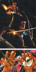 Когда же наш катер подвалил к хлипкому причалу у скалистого берега малого Пхи-пхи, волнение мое достигло предела: вот оно обиталище саланган, угодья охотников за «ласточкиными гнездами»! Но гид, обходя бамбуковые шесты (об их назначении я расскажу чуть позже), ввел всех в пещеру и стал что-то показывать внизу скалы. Я вгляделся и увидел три силуэта кораблей с парусной оснасткой, слегка выступающих на темной поверхности стены.