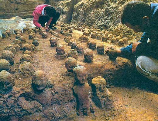 Пока из земли извлечено около 700 солдат. И ни один не похож на другого, с выражениями лиц от задумчивых до строгих и суровых. Но больше было спокойных. И это говорило об относительном спокойствии и процветании Поднебесной империи в правление Цзин-ди — со 157 по 141 год до н.э. Предназначенные для подземных сражений, воины были снабжены всем необходимым. Бронзовые монеты, мерные чашки для зерна, трехгранные наконечники для стрел. Позеленевшая бронза хорошо сохранилась. Начались планомерные археологические раскопки близ древней столицы Ханьской империи — города Чанъань. Идут они медленно: рабочие заняты на своих полях. Тем не менее раскопки этого захоронения ханьских императоров — наверное, одна из самых значительных археологических работ в Китае.