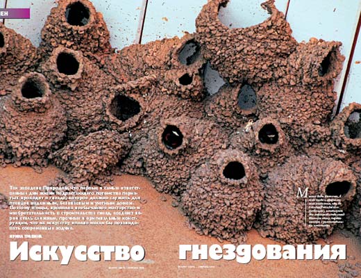 Благодатным материалом для строительства гнезда служит глина. Сороки, дрозды-рябинники промазывают ею лоток гнезда, многие виды ласточек лепят из нее гнезда-кувшинчики самой разнообразной формы. Но наиболее основательные глиняные постройки возводят южноамериканские птички – рыжие печники. На толстых горизонтальных ветвях, столбах изгородей или крышах домов они устраивают из комочков смешанной с навозом глины массивный фундамент будущей постройки, затем выкладывают стены и куполообразное перекрытие. Получается похожее на круглую печь сооружение с овальным входом-летком, ведущим в «переднюю», через невысокую перегородку от которой располагается выстланная мягким материалом гнездовая камера. Высохнув под лучами жаркого солнца, стенки постройки становятся прочны, как камень, и разбить их можно только с помощью кувалды.