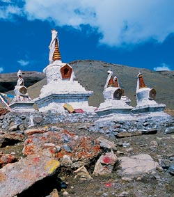 Долгие переезды, усталость и в довершение ко всему некоторая потеря ориентации вынуждают нас заночевать там, где при свете дня мы в последний раз видели дорогу. Наутро оказалось, что мы находимся прямо у Кайласа, священной для всех буддистов мира горы. Говорят, если совершить 108 раз подряд Малую Кору – то есть обойти вокруг подножия, – можно обрести доступ к Большой Коре, которая откроет вход в рериховскую Шамбалу, страну, где нет страдания. Здесь же в небольшом, выдолбленном в скале монастыре Дзянджа, возраст которого насчитывает 800 лет, живут те, кто желает совершить этот религиозный подвиг. Неизвестно, удался ли он кому-нибудь, но монастырь полон субурганов (молитвенных сооружений на пьедестале и со шпилями), исписанных мантрами о даровании сил и успеха.