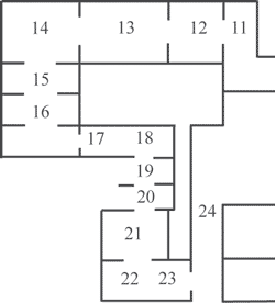 На первом этаже северо-западного ризалита император Александр I занимал помещения от Салтыковского подъезда до тамбура, выходящего к Адмиралтейству. До пожара 1837 г. дверь с тамбуром находилась на месте цокольного окна – второго от северо-западного угла ризалита. В подвальной угловой комнате размещалась Уборная Александра I (под залом № 17 – ее часть), откуда деревянная лестница вела в четыре помещения первого этажа (№ 17 и № 18), обращенные на Салтыковский подъезд, и в царскую баню с окнами во двор (№ 411). Известно также, что под Большим кабинетом Александра I располагалась его Приемная на три окна в сторону Адмиралтейства (№ 19 и № 20).