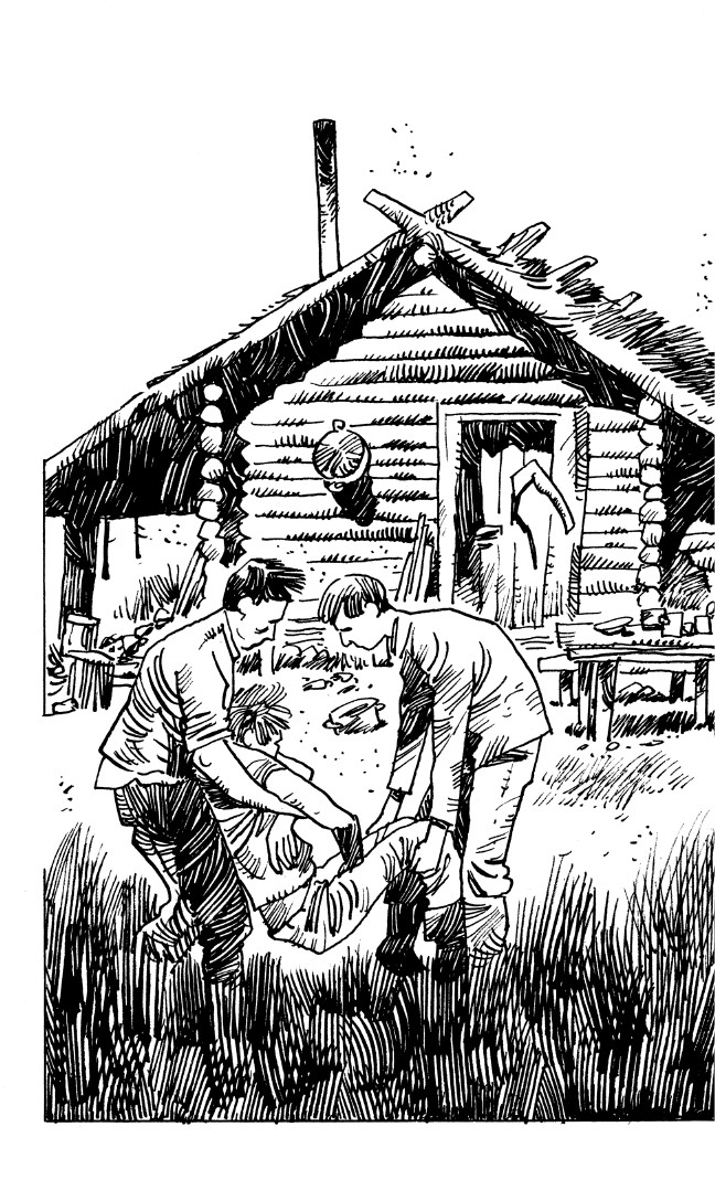 Не успел он договорить, как за избушкой послышался слабый стон. Мы бросились туда и увидели человека, лежащего на спине без сознания, с безвольно раскинутыми в стороны тонкими плетями рук и ног. Человек слабо шевелился и стонал. Он был невысокого роста, со свалявшейся светло-рыжей копной волос на голове, которые напоминали болотную кочку с пожухлой травой. Лицо обросло неопрятной щетиной.
