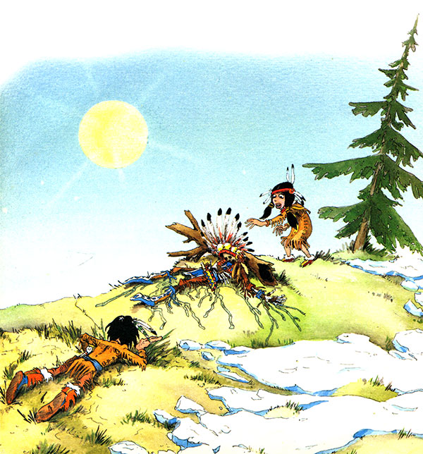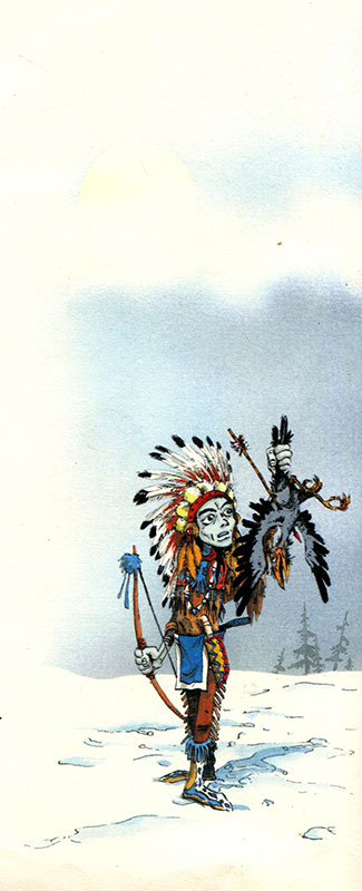 Однако воин из снега не знал, как выглядит дрозд. За свою короткую жизнь он не видел этой птицы и очень смутился. Но жена проявила нетерпение, настаивала на своем, тогда он пустил стрелу в первую пролетавшую мимо птицу и попал в большую ворону: