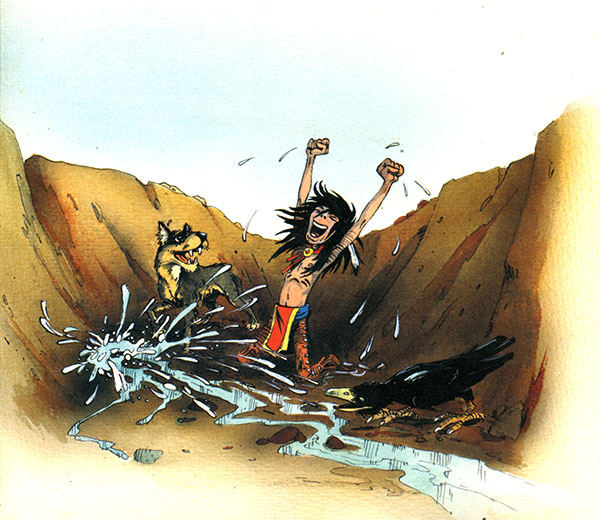 Теперь они втроем бродили по раскаленной пустыне, осматривали каждое растеньице. Три долгих дня они провели в поисках, но целебную траву так и не нашли. Силы постепенно оставляли Лосиное Сердце, и наконец он устало опустился на землю. Большая черная птица села ему на плечо и обмахивала его своими широкими крыльями. Степной волк охранял его от ядовитых змей. И Лосиному Сердцу приснился удивительный сон: Росянка явилась ему бледная и худая, но прекрасная. Она тихо напевала песню, звучавшую подобно журчанию ручья. Затем она исчезла, и он увидел широкую прозрачную речку и услышал