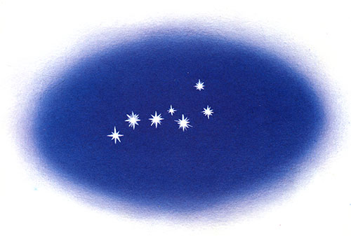 В этом бедственном положении Оникар взглянул на звездное небо и заметил над кленом участок небосвода, на котором не мерцала ни одна звездочка. Теперь он знал, что ему надлежит сделать. С помощью семи стрел, которые еще были в его колчане, он одного за другим посылал братьев в небо и каждый раз кричал: