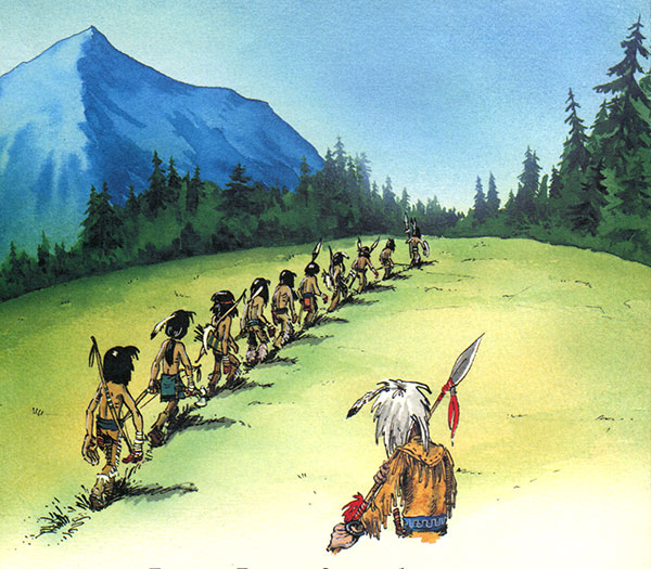 После того как молодые индейцы обеспечили старика в достатке пищей, они надели свои лучшие мокасины (мягкая обувь из оленьей кожи), взяли луки, стрелы и томагавки и отправились в чащу огромного леса.