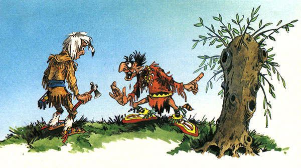 Будто ураган проносился сквозь трухлявые ветви, хотя кругом не было ни ветерка. Бесстрашно старый ирокез последовал за шумом, пока он не привел его к изуродованной иве, которую показал ему во сне его дух-покровитель. Томагавком он осторожно расщепил дуплистый ствол, из которого вывалился дряхлый человечек. У него была малюсенькая голова и огромные ноги, обутые в изношенные мокасины, а спина его была круглая, как тыква.