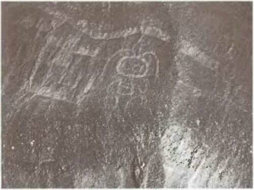 На вершине холма сохранились остатки совсем небольших изображений. Здесь и разные животные, переплетающиеся, словно на страницах комикса; среди них выделяется существо с длинным, как у динозавров, хвостом. Привет тебе, коллекция Кабреры! К сожалению, снимки других животных из этой серии не получились. Яи сегодня ругаю себя за то, что не упросил Эдуардо совершить еще хотя бы несколько кругов над холмом. Поэтому в этой книге я смог опубликовать лишь фрагмент этой интереснейшей «картинной галереи».