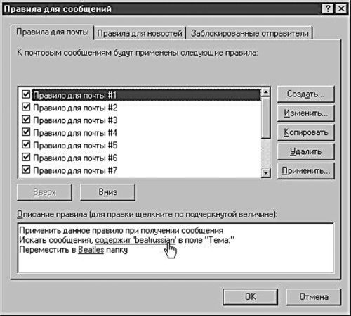 Включить и настроить Сортировщик писем Outlook Express вы можете в меню Сервис Правила для сообщений Почта (в Outlook Express 4 Сортировка сообщений).