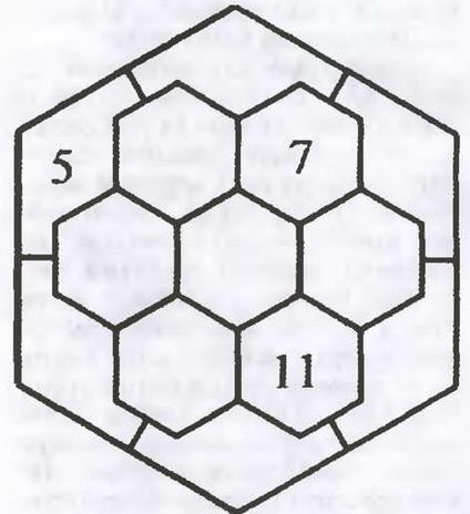 Тринадцать областей на рисунке необходимо заполнить числами от 1 до 13 (три из них уже показаны) таким образом, чтобы числа в соседних областях отличались между собой не менее, чем на 2 (1 и 3 в соседних областях располагать нельзя, а 1 и 4 можно).